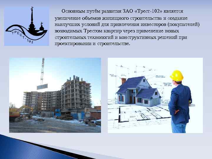 Основным путём развития ЗАО «Трест-102» является увеличение объемов жилищного строительства и создание наилучших условий для привлечения инвесторов (покупателей) возводимых Трестом квартир через применение новых строительных технологий и конструктивных решений при проектировании и строительстве.