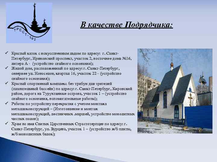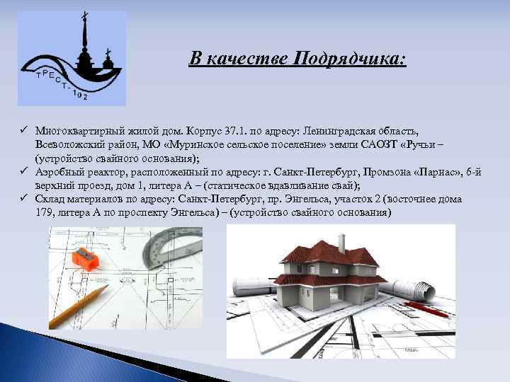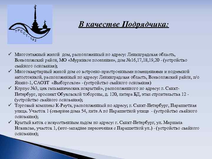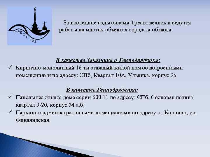 За последние годы силами Треста велись и ведутся работы на многих объектах города и области: В качестве Заказчика и Генподрядчика: ü Кирпично-монолитный 16 -ти этажный жилой дом со встроенными помещениями по адресу: СПб, Квартал 10 А, Ульянка, корпус 2 а. В качестве Генподрядчика: ü Панельные жилые дома серии 600. 11 по адресу: СПб, Сосновая поляна квартал 9 -20, корпус 54 а, б; ü Паркинг с административными помещениями по адресу: г. Колпино, ул. Финляндская.