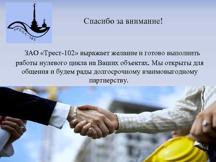 Спасибо за внимание! ЗАО «Трест-102» выражает желание и готово выполнить работы нулевого цикла на Ваших объектах. Мы открыты для общения и будем рады долгосрочному взаимовыгодному партнерству.