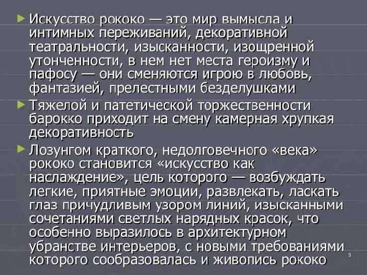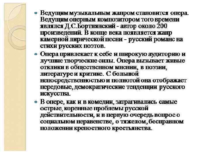 ЖИВОПИСЬ • А. П. АНТРОПОВ – ЕЩЕ ВЛИЯНИЕ ПАРСУННОГО ПОРТРЕТА ПЕТРОВСКОЙ ЭПОХИ • Д. Г. ЛЕВИЦКИЙ – МАСТЕРСТВО, ПРОСТОТА, ПРЕДЕЛЬНАЯ ЯСНОСТЬ ИЗОБРАЖАЕМОГО ПЕРСОНАЖА • Ф. С. РОКОТОВ – НЕДОСКАЗАННОСТЬ, ТАИНСТВЕННОСТЬ, ДУШЕВНАЯ ГЛУБИНА • В. Л. БОРОВИКОВСКИЙ – ЧУВСТВЕННОСТЬ, ЛЮБОВЬ К ПЕРСОНЕ • А. П. ЛОСЕНКО, Г. И. УГРЮМОВ – ИСТОРИЧЕСКАЯ ЖИВОПИСЬ • С. Ф. ЩЕДРИН - ПЕЙЗАЖ