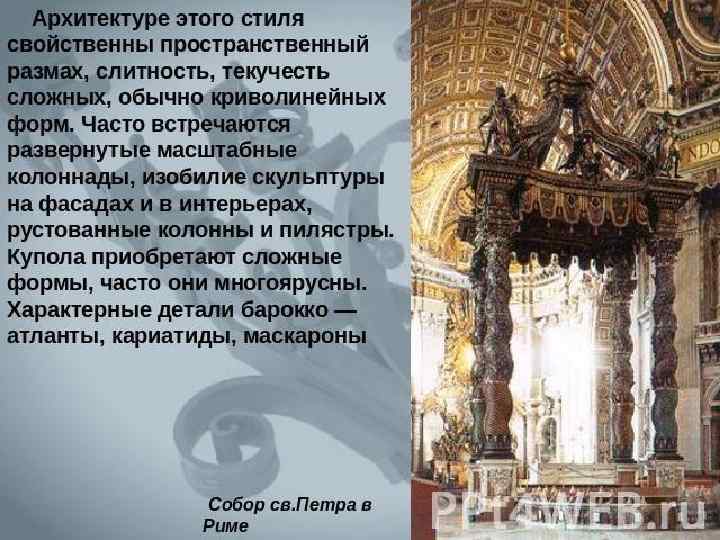 АРХИТЕКТУРА • «ЕЛИЗАВЕТИНСКОЕ» БАРОККО: • В. В. РАСТРЕЛЛИ – САНКТ-ПЕТЕРБУРГ, ПЕТЕРГОФ, ЦАРСКОЕ СЕЛО • С. И. ЧЕВАКИНСКИЙ – САНКТ-ПЕТЕРБУРГ, Д. В. УТХОМСКИЙ - МОСКВА • КЛАССИЦИЗМ: • В. И. БАЖЕНОВ – ДОМ ПАШКОВА В МОСКВЕ • М. Ф. КАЗАКОВ – МОСКОВСКОЕ ДВОРЯНСКОЕ СОБРАНИЕ, МОСКОВСКИЙ УНИВЕРСИТЕТ, ЗДАНИЕ СЕНАТ В КРЕМЛЕ • И. Е. СТАРОВ – ТАВРИЧЕСКИЙ ДВОРЕЦ (САНКТПЕТЕРБУРГ)