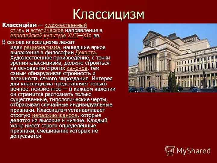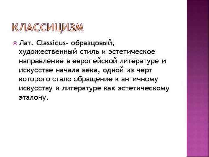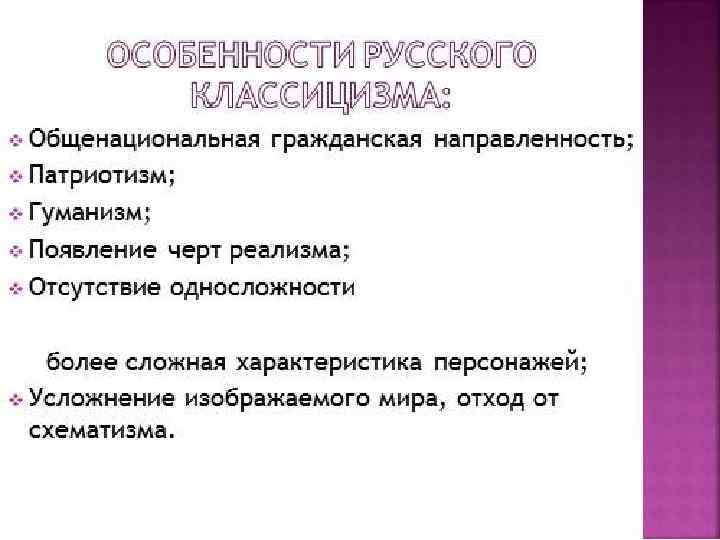 КЛАССИЦИЗМ • ПОДРАЖАНИЕ АНТИЧНОСТИ • ЛИТЕРАТУРА И ИЗОБРАЗИТЕЛЬНОЕ ИСКУССТВО • ДУХ ПРОСВЕЩЕНИЕ И «ПРОСВЕЩЕННОГО АБСОЛЮТИЗМА» • ГЕРОИ – МОНАРХИ И ПОЛКОВОДЦЫ • АБСТРАКТНЫЕ ПРЕДСТАВЛЕНИЯ БЕЗ ИНДИВИДУАЛИЗАЦИИ • СТРОГИЕ КАНОНЫ – ПРАВИЛА БЕЗ НАРУШЕНИЙ