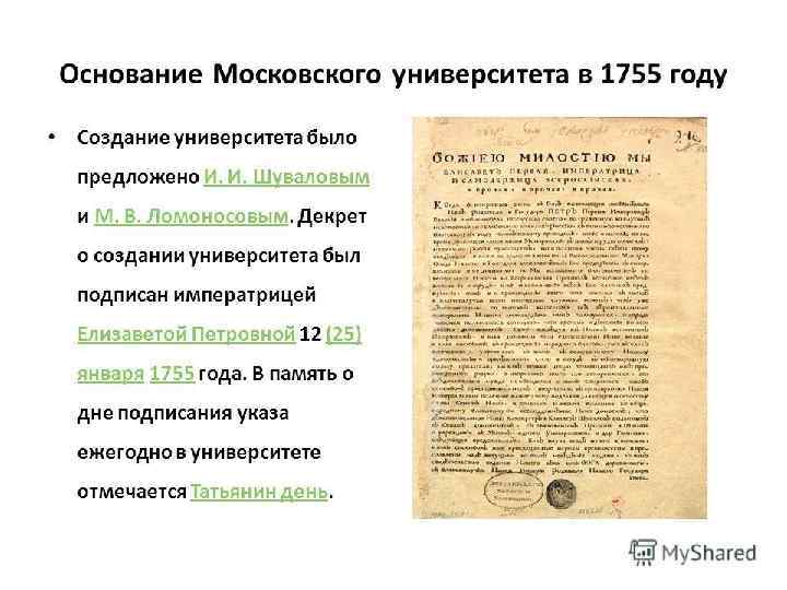 ОБРАЗОВАНИЕ И ПРОСВЕЩЕНИЕ • 1755 Г. – ОТКРЫТИЕ МОСКОВСКОГО УНИВЕРСИТЕТА (М. В. ЛОМОНОСОВ, И. И. ШУВАЛОВ) • БЕСПЛАТНОЕ ОБУЧЕНИЕ, БЕССОСЛОВНОСТЬ (КРОМЕ КРЕПОСТНЫХ), ФИЛОСОФСКИЙ, ЮРИДИЧЕСКИЙ И МЕДИЦИНСКИЙ ФАКУЛЬТЕТЫ, ПРОДОЛЖАЛОСЬ ОБУЧЕНИЕ 7 ЛЕТ • ДВЕ ГИМНАЗИИ: ДЛЯ ДВОРЯН И РАЗНОЧИНЦЕВ • 1758 Г. – ГИМНАЗИЯ В КАЗАНИ • 1780 -Е ГГ. – БЛАГОРОДНЫЙ ПАНСИОН ДЛЯ ДВОРЯН • РАЗРАБОТКА СИСТЕМЫ НАРОДНОГО ПРОСВЕЩЕНИЯ