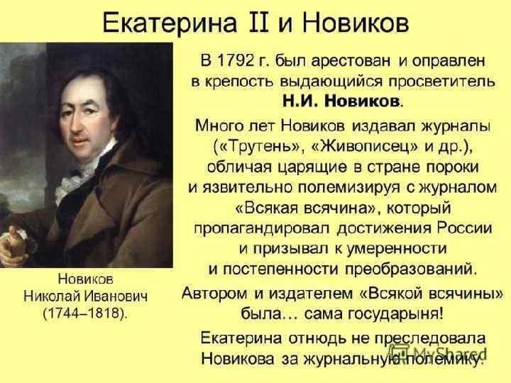 ОБЩЕСТВЕННАЯ МЫСЛЬ • Н. И. НОВИКОВ – ЖУРНАЛ «ТРУТЕНЬ» - САТИРА – ТЮРЬМА – ОСВОБОДИЛ ПАВЕЛ I • КНЯЗЬ М. М. ЩЕРБАТОВ – «О ПОВРЕЖДЕНИИ НРАВОВ В РОССИИ» (1786 – 1787 ГГ. ) – КРИТИКА БЕЗНАРВСТВЕННОСТИ У ВЕРХУШКИ СО ВРЕМЕН ПЕТРА I ДО ЕКАТЕРИНЫ II • А. Н. РАДИЩЕВ – «ПУТЕШЕСТВИЕ ИЗ ПЕТЕРБУРГА В МОСКВУ» (1790 Г. ) – КРИТИКА КРЕПОСТНИЧЕСТВА – ССЫЛКА В СИБИРЬ