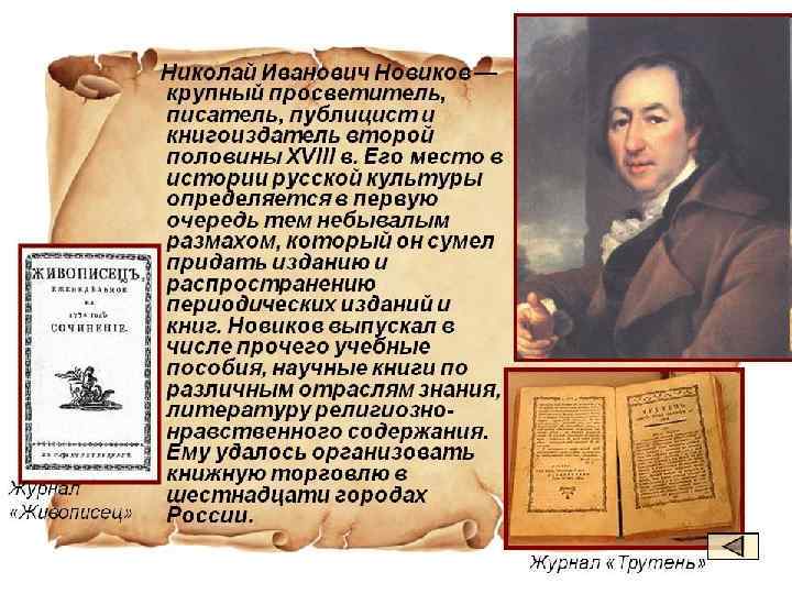 ПЕЧАТЬ • Н. И. НОВИКОВ • ИЗДАВАЛ В КОНЦЕ 1760 -Х ГГ. – «ТРУТЕНЬ» , «ЖИВОПИСЕЦ» И ДРУГИЕ САТИРИЧЕСКИЕ ЖУРНАЛЫ • 1779 Г. – ВОЗГЛАВИЛ ТИПОГРАФИЮ МОСКОВСКОГО УНИВЕРСИТЕТА • НАЛАДИЛ СБЫТ ПРОДУКЦИИ В КРУПНЕЙШИХ ГОРОДАХ • 1783 Г. – УКАЗ «О ВОЛЬНЫХ ТИПОГРАФИЯХ» МОЖНО ИЗДАВАТЬ ВСЕМ ЖЕЛАЮЩИМ – ПЕРВЫЙ ЖУРНАЛ В ПРОВИНЦИИ – ЯРОСЛАВСКИЙ «УЕДИНЕННЫЙ ПОШЕХОНЕЦ»