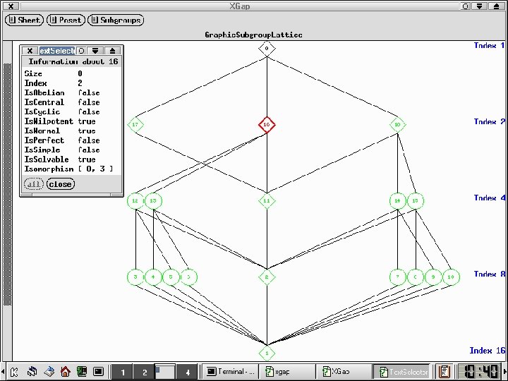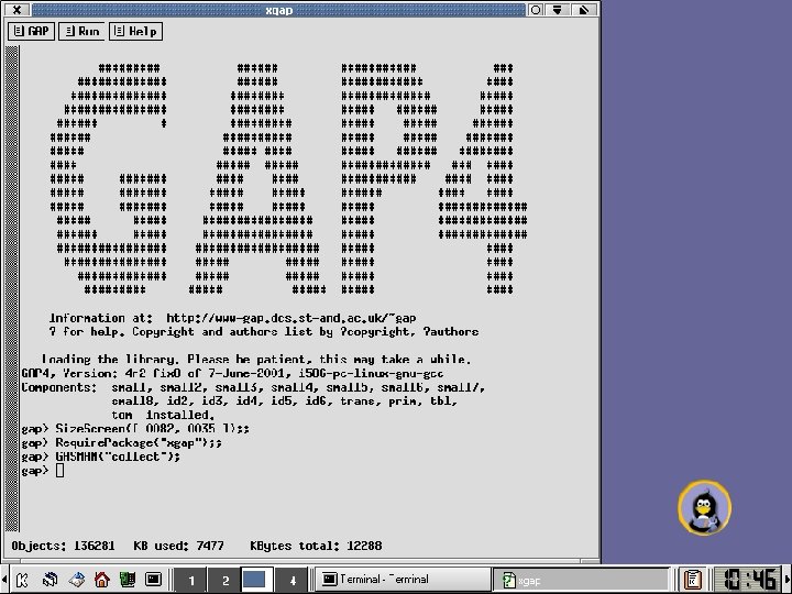 ############### # ##### ####### ##### ############### ###### ########## ##### ##### ################ ##### ###### ######### ##### ##### ###### ############# #### ##### ############# ##### ##### #### Information at: http: //www. gap-system. org Try '? help' for help. See also '? copyright' and '? authors' Loading the library. Please be patient, this may take a while. GAP 4, Version: 4. 4. 3 of 3 -May-2004, i 686 -pc-cygwin-gcc Components: small 2. 0, small 2 2. 0, small 3 2. 0, small 4 1. 0, small 5 1. 0, small 6 1. 0, small 7 1. 0, small 8 1. 0, id 2 3. 0, id 3 2. 1, id 4 1. 0, id 5 1. 0, id 6 1. 0, trans 1. 0, prim 2. 1 loaded. Packages: AClib 1. 1, Polycyclic 1. 1, Alnuth 1. 0, Cryst. Cat 1. 1. 2, Cryst 4. 1. 4, Aut. PGrp 1. 2, CTbl. Lib 1. 1. 3, Tom. Lib 1. 1. 1, Fact. Int 1. 3. 1, GAPDoc 0. 9999, LAGUNA 3. 3, Sophus 1. 11, Polenta 1. 1, Res. Classes 1. 1. 1 loaded. gap>