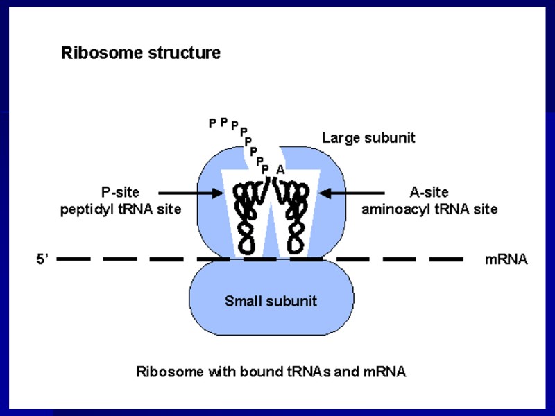 Принципы трансляции Расшифровка генетического кода в направлении 5’ – 3’ AUG – кодон инициации UAG или UGA или UAA – кодоны STOP Осуществляется тРНК по принципу комплементарности Синтез полипептида в направлении NH2 – COOH Происходит в рибосомах