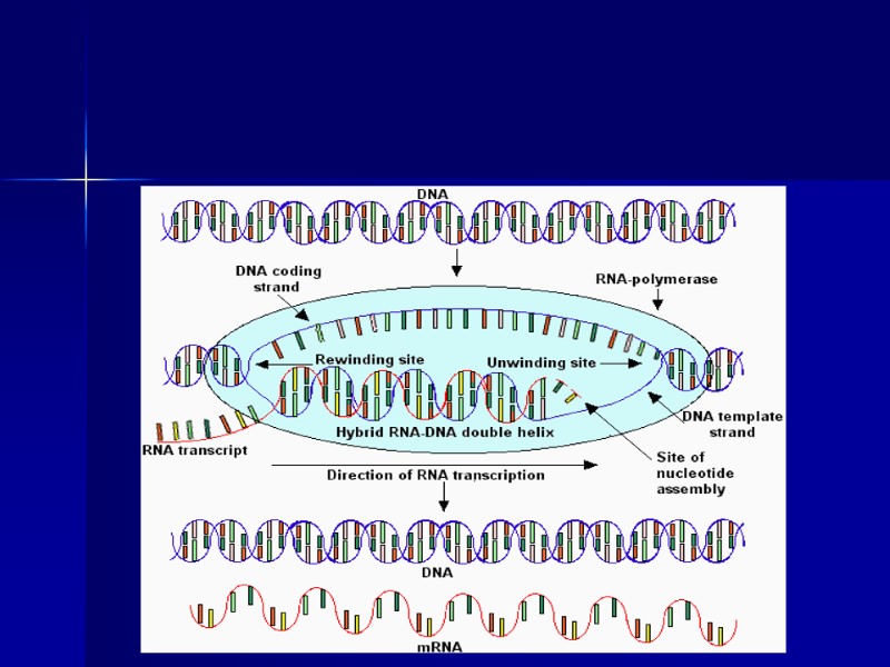 Транскрипция – это молекулярный процесс копирования генетической информации с ДНК на РНК. 5’-ATTGCATGATTACCATGTA-3’ Кодогенная цепь (нетранскрибируемая) 3’-TAACGTACTAATGGTACAT-5’ Некодогенная (транскрибируемая) 5’-AUUGCAUGAUUACCAUGUA-3’ ARN *** Принципы транскрипции: ! Матричный синтез ! Комплементарный принцип ! Антипаралельный процесс ! Однонаправленная реакция