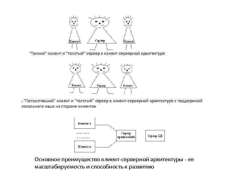 "Тонкий" клиент и "толстый" сервер в клиент-серверной архитектуре . "Потолстевший" клиент и "толстый" сервер в клиент-серверной архитектуре с поддержкой локального кэша на стороне клиентов Основное преимущество клиент-серверной архитектуры - ее масштабируемость и способность к развитию