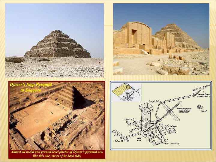 Пирамида Джосера была центром сложного ансамбля из молелен и дворов. Ансамбль, не отличавшийся еще стройностью общей планировки, был расположен на искусственной террасе и занимал площадь в 544, 9 * 277, 6 м. Террасу окружала облицованная камнем стена в 14, 8 м толщиной и в 9, 6 м высотой. Сама пирамида достигала в высоту свыше 60 м и состояла как бы из семи мастаба, поставленных одна на другую. Основной строительный материал – камень.