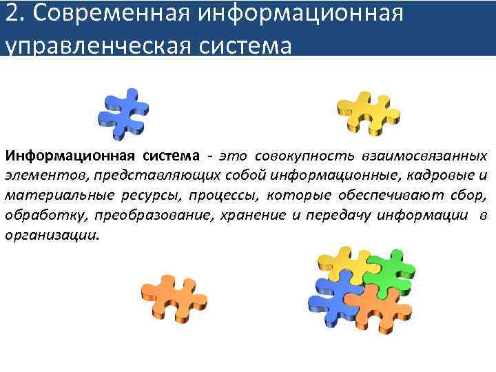 2. Современная информационная управленческая система Информационная система - это совокупность взаимосвязанных элементов, представляющих собой информационные, кадровые и материальные ресурсы, процессы, которые обеспечивают сбор, обработку, преобразование, хранение и передачу информации в организации.