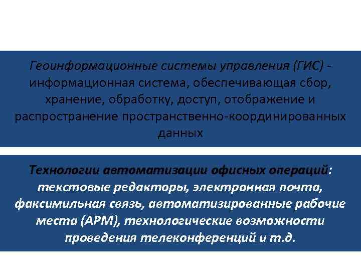 Геоинформационные системы управления (ГИС) информационная система, обеспечивающая сбор, хранение, обработку, доступ, отображение и распространение пространственно-координированных данных Технологии автоматизации офисных операций: операций текстовые редакторы, электронная почта, факсимильная связь, автоматизированные рабочие места (АРМ), технологические возможности проведения телеконференций и т. д.