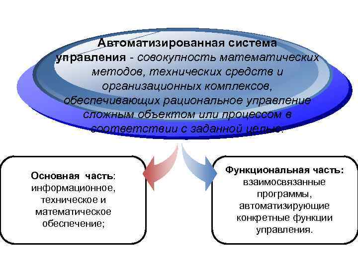 Автоматизированная система управления - совокупность математических методов, технических средств и организационных комплексов, обеспечивающих рациональное управление сложным объектом или процессом в соответствии с заданной целью. Основная часть: информационное, техническое и математическое обеспечение; Функциональная часть: взаимосвязанные программы, автоматизирующие конкретные функции управления.