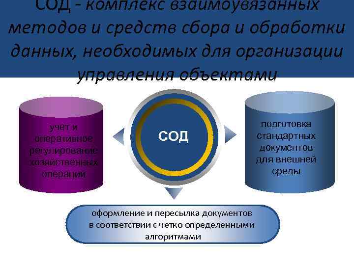 СОД - комплекс взаимоувязанных методов и средств сбора и обработки данных, необходимых для организации управления объектами учет и оперативное регулирование хозяйственных операций СОД оформление и пересылка документов в соответствии с четко определенными алгоритмами подготовка стандартных документов для внешней среды