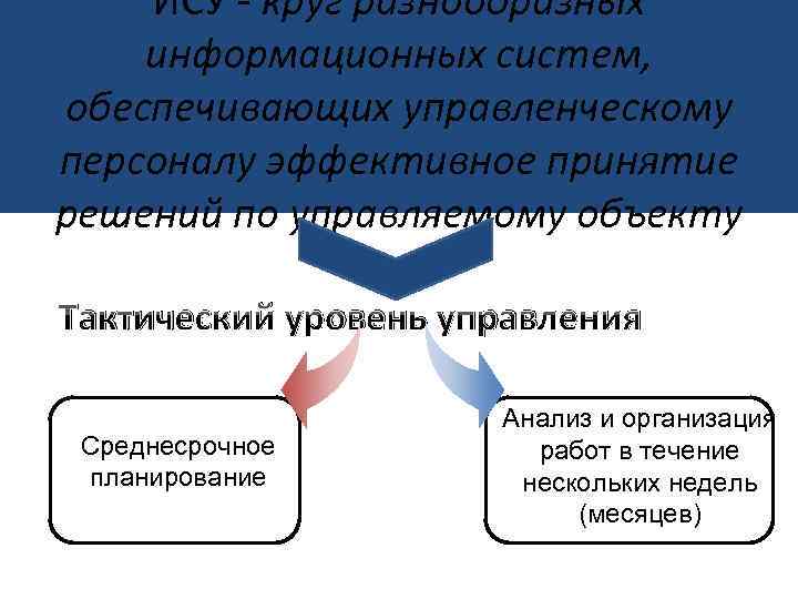 ИСУ - круг разнообразных информационных систем, обеспечивающих управленческому персоналу эффективное принятие решений по управляемому объекту Тактический уровень управления Среднесрочное планирование Анализ и организация работ в течение нескольких недель (месяцев)