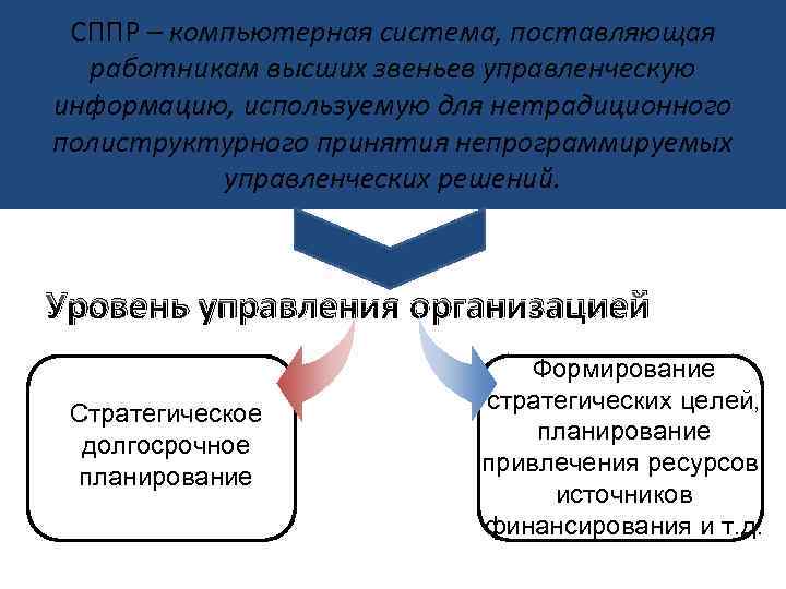 СППР – компьютерная система, поставляющая работникам высших звеньев управленческую информацию, используемую для нетрадиционного полиструктурного принятия непрограммируемых управленческих решений. Уровень управления организацией Стратегическое долгосрочное планирование Формирование стратегических целей, планирование привлечения ресурсов, источников финансирования и т. д.