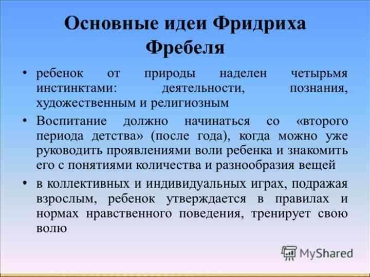 Значение Фребеля в истории педагогики определяется тем, что: -он способствовал выделению дошкольной педагогики в самостоятельную отрасль науки, -впервые создал теорию работы дошкольных учреждений. - он много сделал для пропаганды идеи дошкольного воспитания и широкого распространения детских садов.