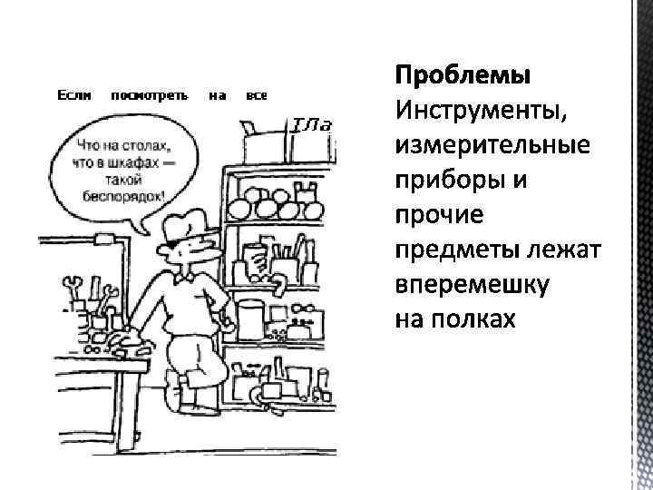 Ключевые моменты: • Наведите порядок в размещении предметов на рабочих местах. • Ко всем полкам прикрепите бирки с названиями и номерами размещенных на них предметов.