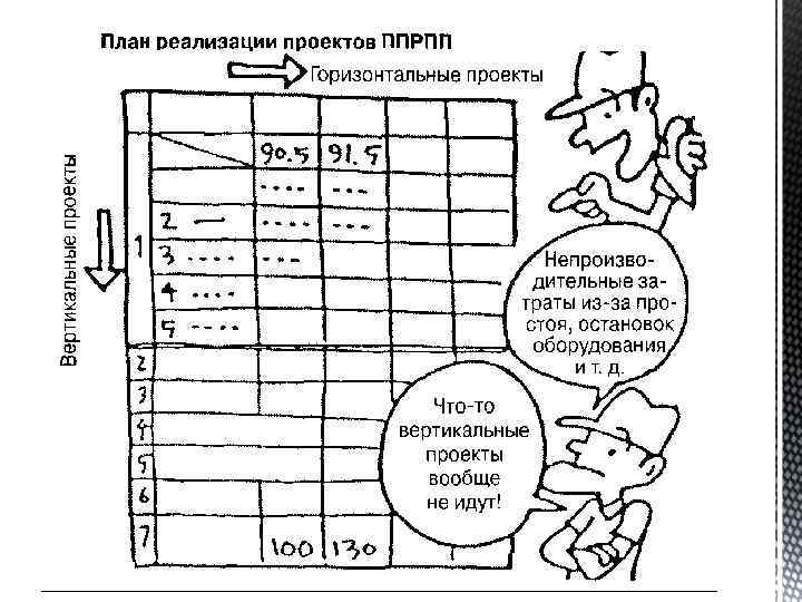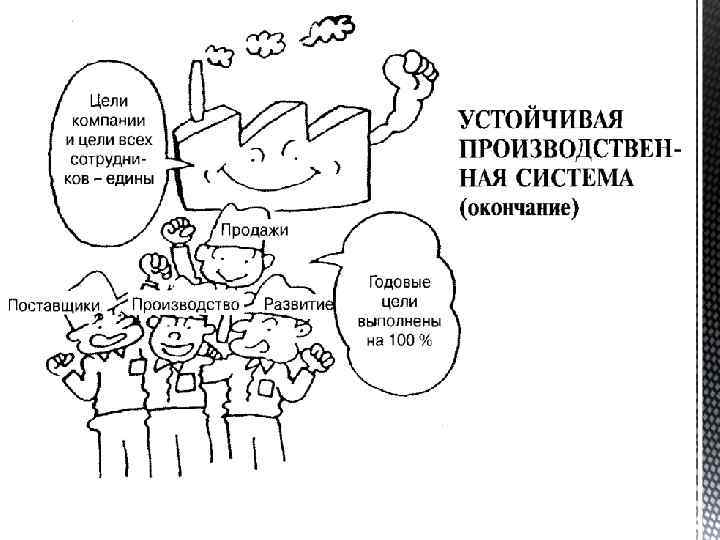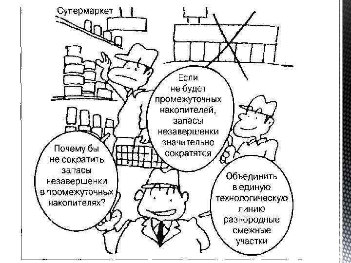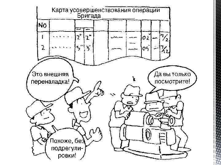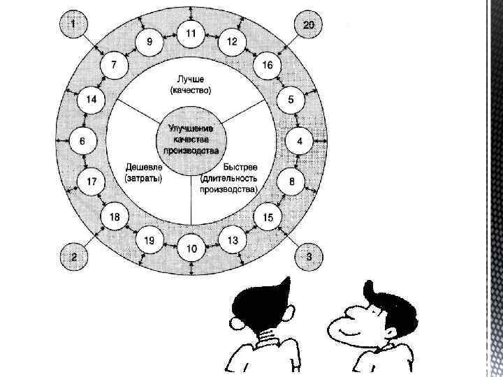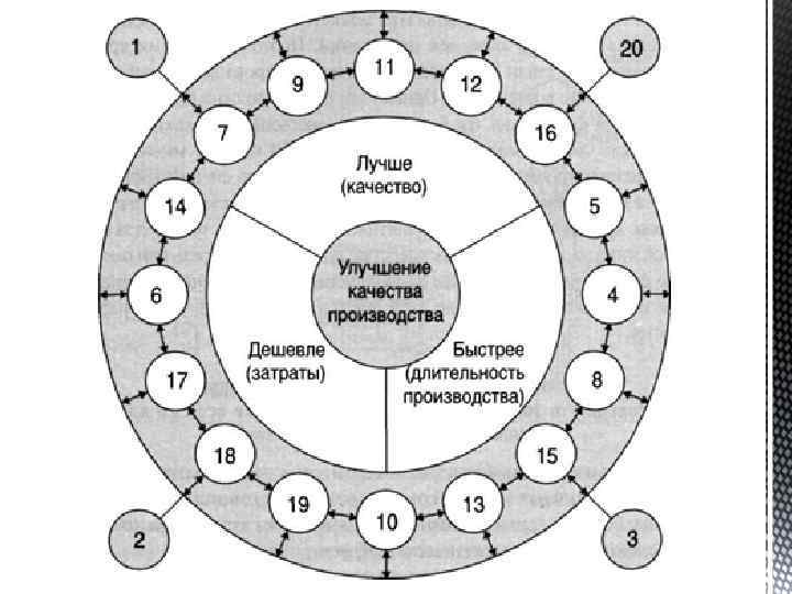 Ключ 1 Упорядочение Ключ 2 Совершенствование вертикальной структуры управления. Управление по целям Ключ 3 Командная работа. Деятельность малых групп Ключ 4 Сокращение запасов незавершенной продукции (сокращение продолжительности производственного цикла) Ключ 5 Технология быстрой переналадки оборудования Ключ 6 Усовершенствование производственных операций (стоимостной анализ производства) Ключ 7 Производство без постоянного присмотра Ключ 8 Промежуточные накопители между смежными организационно-технологическими участками Ключ 9 Техническое обслуживание оборудования Ключ 10 Регламент труда и отдыха Ключ 11 Система обеспечения качества Ключ 12 Помощь поставщикам в повышении эффективности производственной системы Ключ 13 Устранение непроизводительных затрат с помощью карты «горных сокровищ» Ключ 14 Создание благоприятных условий для самостоятельной работы по усовершенствованию Ключ 15 Совмещение профессий Ключ 16 Управление производственно-технологическими процессами Ключ 17 Управление повышением производительности труда Ключ 18 Компьютеризация и автоматизация Ключ 19 Энерго- и ресурсосбережение Ключ 20 Характеристические и новые технологии