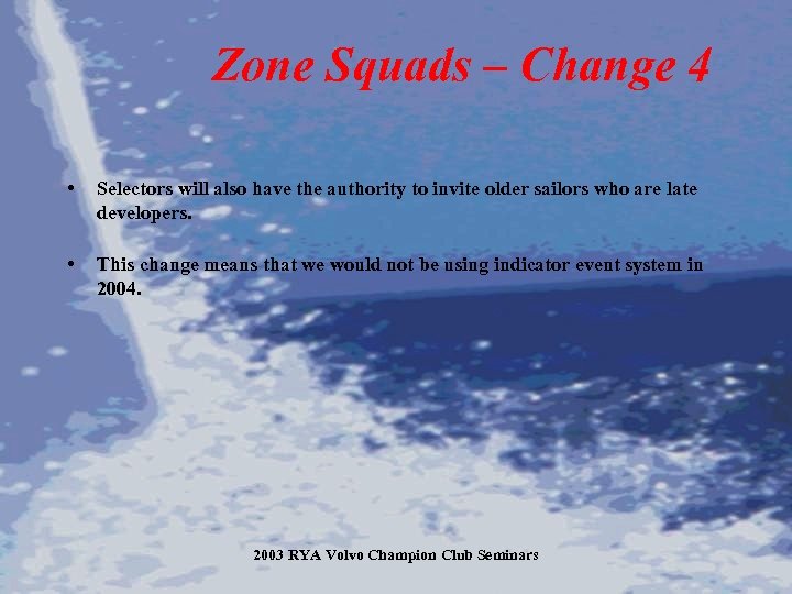 Zone Squads – Change 4 • Selectors will also have the authority to invite older sailors who are late developers. • This change means that we would not be using indicator event system in 2004. 2003 RYA Volvo Champion Club Seminars