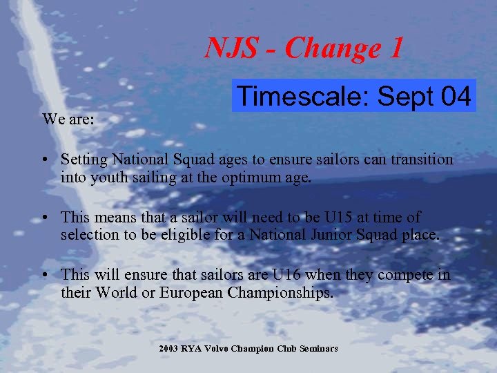 NJS - Change 1 We are: Timescale: Sept 04 • Setting National Squad ages to ensure sailors can transition into youth sailing at the optimum age. • This means that a sailor will need to be U 15 at time of selection to be eligible for a National Junior Squad place. • This will ensure that sailors are U 16 when they compete in their World or European Championships. 2003 RYA Volvo Champion Club Seminars