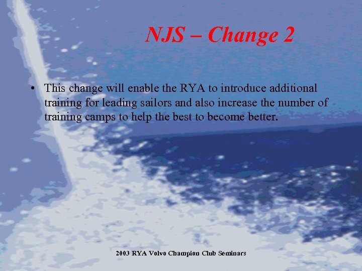 NJS – Change 2 • This change will enable the RYA to introduce additional training for leading sailors and also increase the number of training camps to help the best to become better. 2003 RYA Volvo Champion Club Seminars