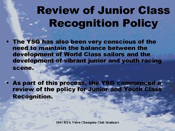 Review of Junior Class Recognition Policy • The YSG has also been very conscious of the need to maintain the balance between the development of World Class sailors and the development of vibrant junior and youth racing scene. • As part of this process, the YSG commenced a review of the policy for Junior and Youth Class Recognition. 2003 RYA Volvo Champion Club Seminars