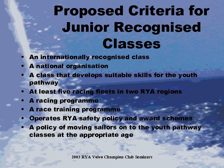 Proposed Criteria for Junior Recognised Classes • An internationally recognised class • A national organisation • A class that develops suitable skills for the youth pathway • At least five racing fleets in two RYA regions • A racing programme • A race training programme • Operates RYA safety policy and award schemes • A policy of moving sailors on to the youth pathway classes at the appropriate age 2003 RYA Volvo Champion Club Seminars