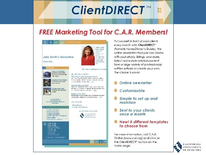 • • • Comprehensive tools to manage and analyze foreclosure business Generate more leads from your website Get listings priced to sell and buyers off the fence Get short sale and REO transactions approved Find more Short sale and REO business Featured in 60 minutes, Forbes, Bloomberg, LA Times, etc. Visit www. foreclosureradar. com and Enter promo code SWATØ 9 for a FREE 7 Day Trial and an exclusive C. A. R. 10% discount. For more information visit the C. A. R. Business Product Table in the Foyer