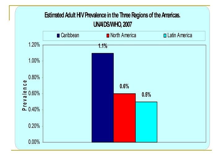 Overall figures – Caribbean n HIV Prevalence remains high among Men who have Sex with Men, Male Sex Workers, Female Sex Workers, Crack Cocaine Users, Prisoners, and Young People n In 2007, 20, 000 New HIV Infections occurred n Total of 230, 00 people living with HIV from 210, 000 in 2001 n Adult HIV prevalence at 1. 1% and increasingly affecting females n 14, 000 people died of AIDS: leading cause of death in the 2544 years-old