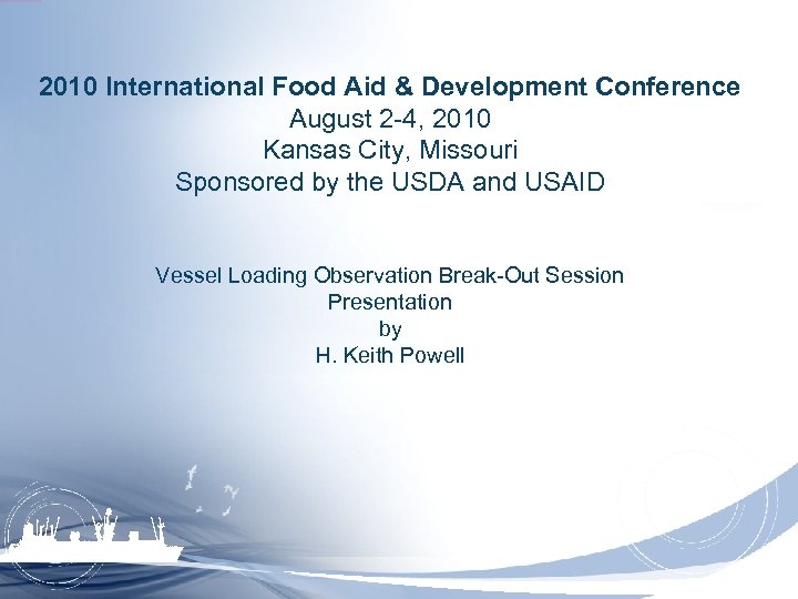 2010 International Food Aid & Development Conference August 2 -4, 2010 Kansas City, Missouri Sponsored by the USDA and USAID Vessel Loading Observation Break-Out Session Presentation by H. Keith Powell