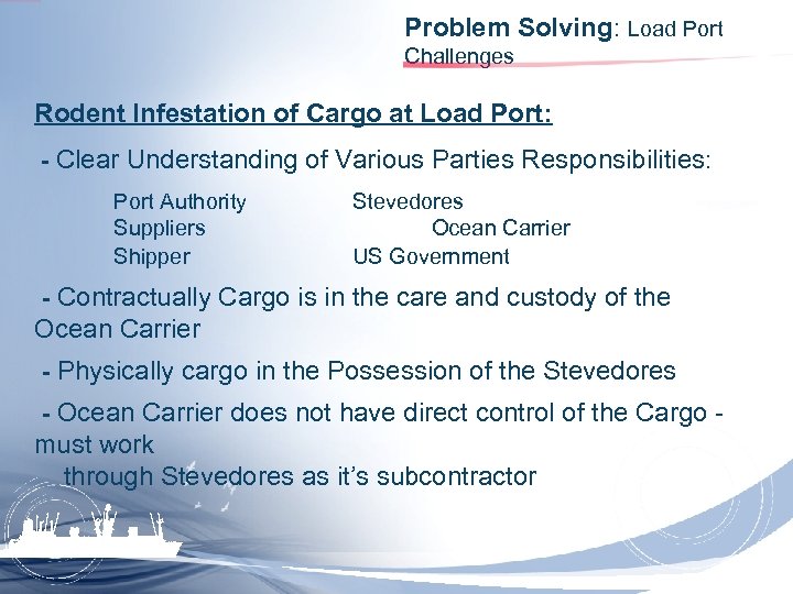 Problem Solving: Load Port Challenges Rodent Infestation of Cargo at Load Port: - Clear Understanding of Various Parties Responsibilities: Port Authority Suppliers Shipper Stevedores Ocean Carrier US Government - Contractually Cargo is in the care and custody of the Ocean Carrier - Physically cargo in the Possession of the Stevedores - Ocean Carrier does not have direct control of the Cargo - must work through Stevedores as it’s subcontractor