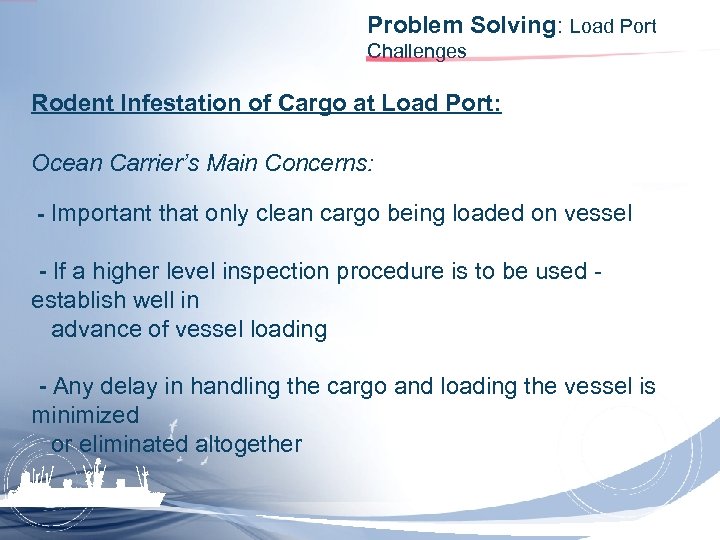 Problem Solving: Load Port Challenges Rodent Infestation of Cargo at Load Port: Ocean Carrier’s Main Concerns: - Important that only clean cargo being loaded on vessel - If a higher level inspection procedure is to be used establish well in advance of vessel loading - Any delay in handling the cargo and loading the vessel is minimized or eliminated altogether