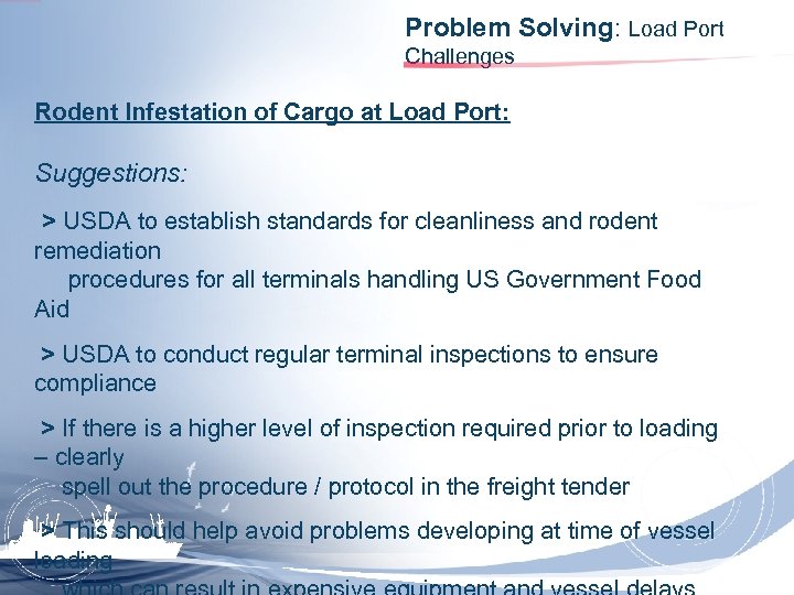 Problem Solving: Load Port Challenges Rodent Infestation of Cargo at Load Port: Suggestions: > USDA to establish standards for cleanliness and rodent remediation procedures for all terminals handling US Government Food Aid > USDA to conduct regular terminal inspections to ensure compliance > If there is a higher level of inspection required prior to loading – clearly spell out the procedure / protocol in the freight tender > This should help avoid problems developing at time of vessel loading