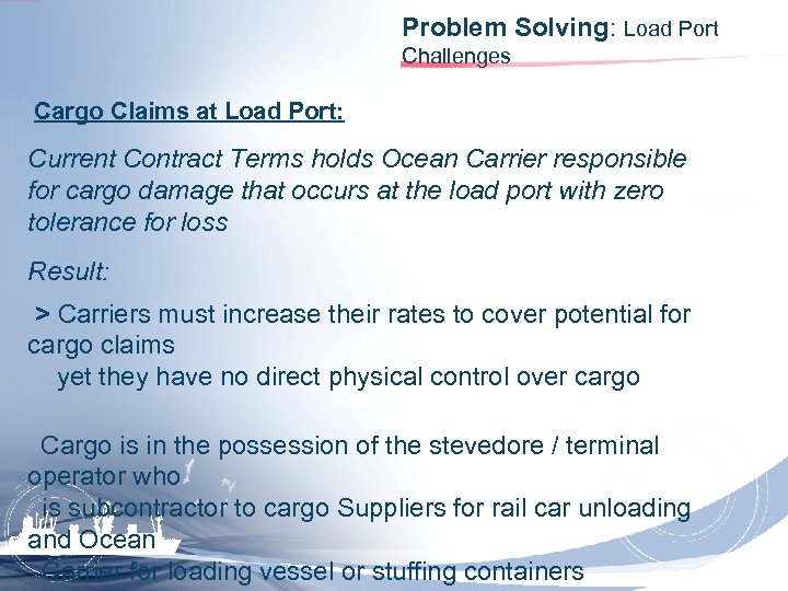 Problem Solving: Load Port Challenges Cargo Claims at Load Port: Current Contract Terms holds Ocean Carrier responsible for cargo damage that occurs at the load port with zero tolerance for loss Result: > Carriers must increase their rates to cover potential for cargo claims yet they have no direct physical control over cargo Cargo is in the possession of the stevedore / terminal operator who is subcontractor to cargo Suppliers for rail car unloading and Ocean Carrier for loading vessel or stuffing containers