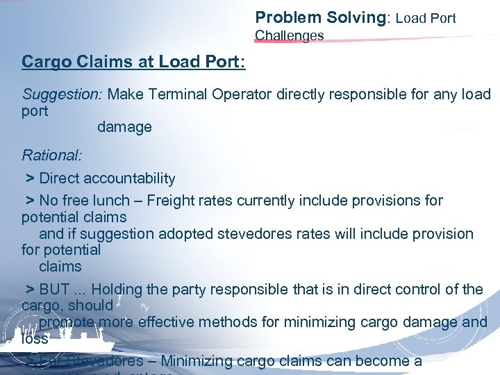 Problem Solving: Load Port Challenges Cargo Claims at Load Port: Suggestion: Make Terminal Operator directly responsible for any load port damage Rational: > Direct accountability > No free lunch – Freight rates currently include provisions for potential claims and if suggestion adopted stevedores rates will include provision for potential claims > BUT. . . Holding the party responsible that is in direct control of the cargo, should promote more effective methods for minimizing cargo damage and loss > For Stevedores – Minimizing cargo claims can become a