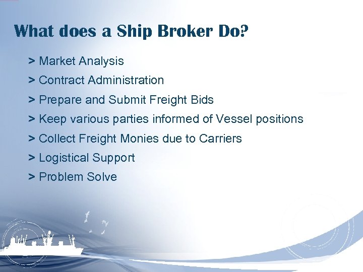 What does a Ship Broker Do? > Market Analysis > Contract Administration > Prepare and Submit Freight Bids > Keep various parties informed of Vessel positions > Collect Freight Monies due to Carriers > Logistical Support > Problem Solve