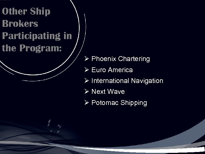 Other Ship Brokers Participating in the Program: Ø Phoenix Chartering Ø Euro America Ø International Navigation Ø Next Wave Ø Potomac Shipping