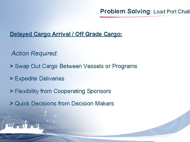 Problem Solving: Load Port Challe Delayed Cargo Arrival / Off Grade Cargo: Action Required: > Swap Out Cargo Between Vessels or Programs > Expedite Deliveries > Flexibility from Cooperating Sponsors > Quick Decisions from Decision Makers
