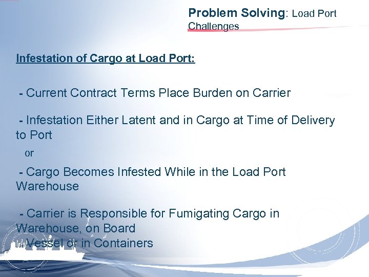 Problem Solving: Load Port Challenges Infestation of Cargo at Load Port: - Current Contract Terms Place Burden on Carrier - Infestation Either Latent and in Cargo at Time of Delivery to Port or - Cargo Becomes Infested While in the Load Port Warehouse - Carrier is Responsible for Fumigating Cargo in Warehouse, on Board Vessel or in Containers
