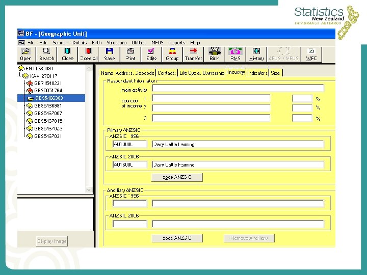 Population frame • Business Frame • • Tax based frame GST registrations No bottom cut-off point for agriculture Compulsory registration at $40, 000 » Partial and unquantifiable coverage of small/hobby farms • Content includes – legal and trading names, address, location, industry, ownership details, business type, size, lifecycle information • Standard classifications eg ANZSIC
