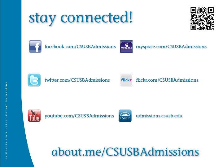 • Admissions & Student Recruitment ………. . . (909) 537 -5188 http: //admissions. csusb. edu • Financial Aid……………………. …. . (909) 537 -5227 http: //finaid. csusb. edu • Campus Tours………………………. . (909) 537 -5192 tours@csusb. edu • Housing…………………………. …. . (909) 537 -4155 http: //housing. csusb. edu • EOP……………………………. . (909) 537 -5042 http: //www-ugs. csusb. edu/eop/ • Testing…………………………. …(909) 537 -5045 http: //www-ugs. csusb. edu/testing/ • Palm Desert Campus (PDC). . ……………(760) 341 -2883 http: //pdc. csusb. edu/