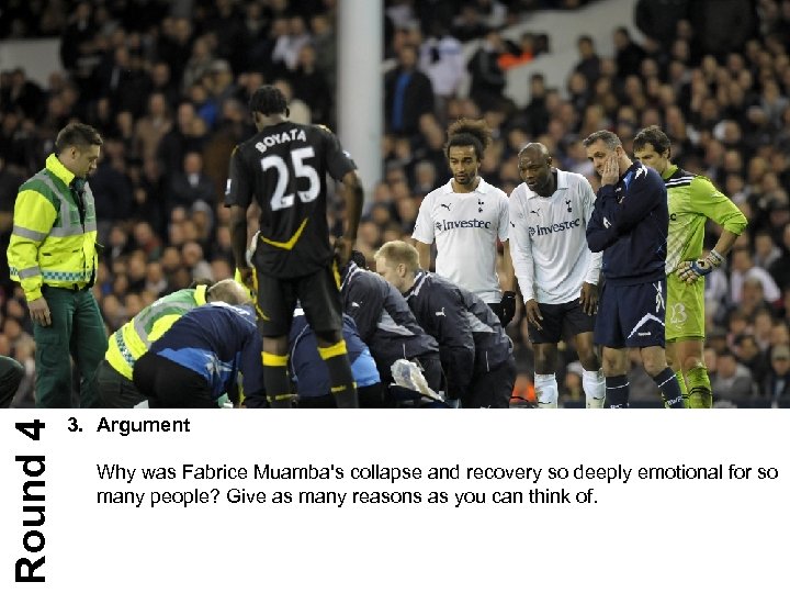 Round 4 3. Argument Why was Fabrice Muamba's collapse and recovery so deeply emotional for so many people? Give as many reasons as you can think of.