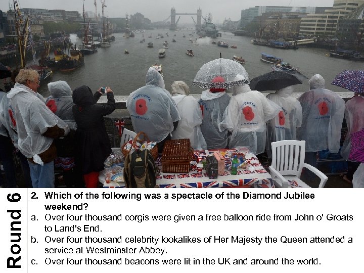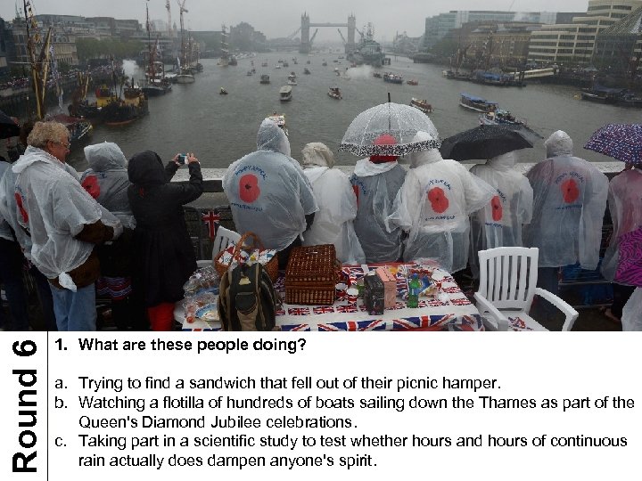Round 6 1. What are these people doing? a. Trying to find a sandwich that fell out of their picnic hamper. b. Watching a flotilla of hundreds of boats sailing down the Thames as part of the Queen's Diamond Jubilee celebrations. c. Taking part in a scientific study to test whether hours and hours of continuous rain actually does dampen anyone's spirit.