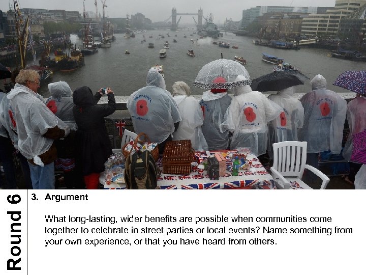 Round 6 3. Argument What long-lasting, wider benefits are possible when communities come together to celebrate in street parties or local events? Name something from your own experience, or that you have heard from others.