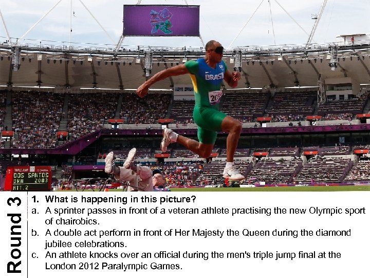 Round 3 1. What is happening in this picture? a. A sprinter passes in front of a veteran athlete practising the new Olympic sport of chairobics. b. A double act perform in front of Her Majesty the Queen during the diamond jubilee celebrations. c. An athlete knocks over an official during the men's triple jump final at the London 2012 Paralympic Games.