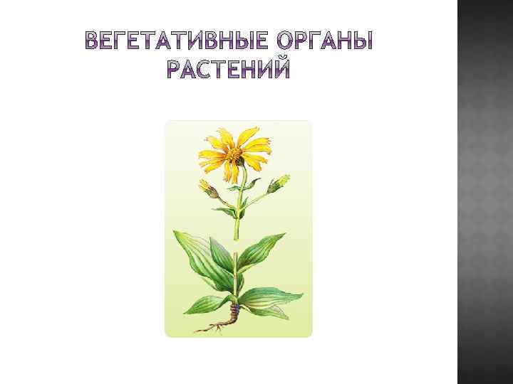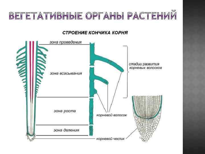 Вопросы для проверки 1) Что относится к вегетативным органам растений? (корень и побег) 2) Что относится к генеративным органам растений? (цветок, плод и семя) 3) Что относится к репродуктивным органам растений? (корень, побег бесполое размножение; цветок, плод и семя - половое размножение) 4) Что такое корень? (вегетативный осевой орган растения, обладающий радиальной симметрией и чаще всего находящийся в почве. На корнях растений никогда не образуется генеративных органов и листьев. ) 5) Какие корневые системы ты знаешь? В чем их отличие, приведи пример? (стержневая - образованная главным и придаточными корнями; мочковатая - придаточными и боковыми корнями, главного корня может и не быть) 6) Перечислите функции корней. (поглощение воды и мин. веществ, опора, запас питательных веществ, синтез органических веществ) 7) Из каких зон состоит корень? (зона корневого чехлика, зона роста, зона всасывания и зона проведения) 8)Какие видоизменения корней ты знаешь? (корнеплод, корневые клубни, клубеньки и дыхательные корни) 9) Какие корни образуются у тропических растений семейства орхидных и ароидных на стеблях? (шнуровидные придаточные воздушные корни, улавливающие атмосферную влагу).