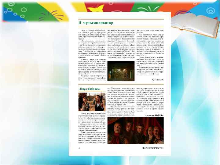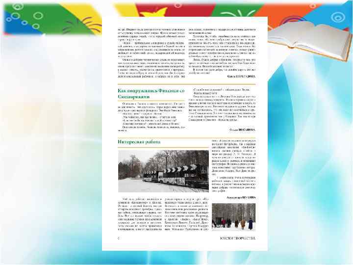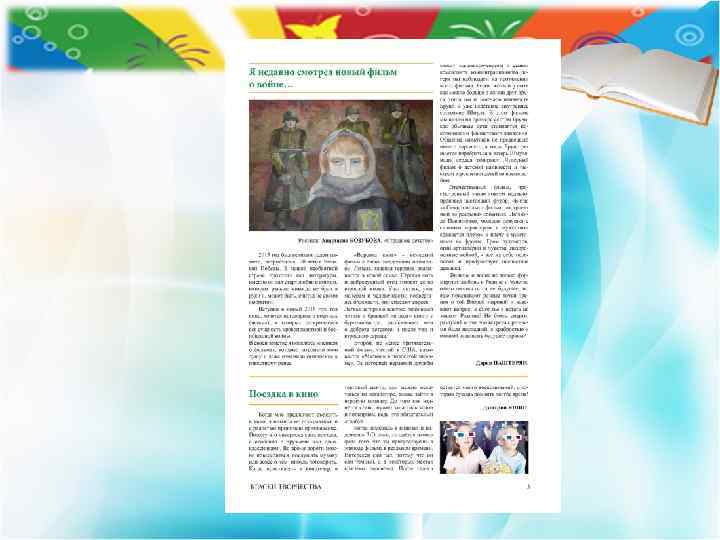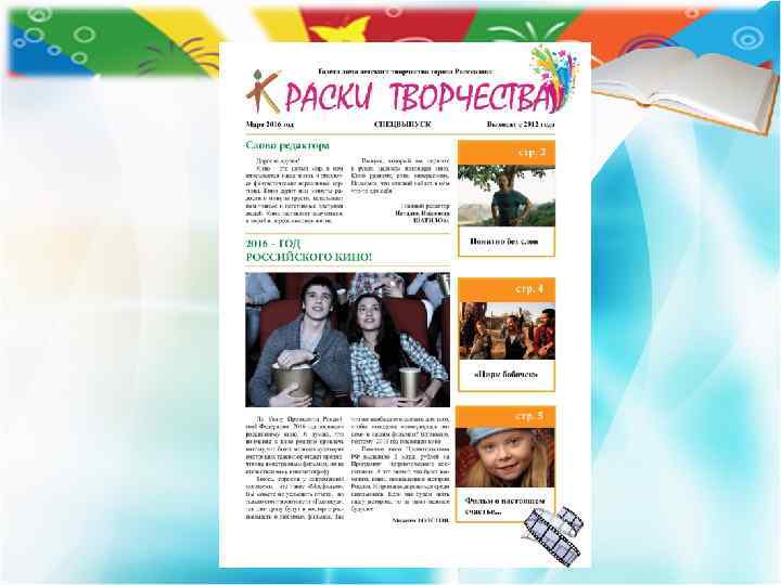 Газета выходит с 2012 года Тираж 50 экз. Периодичность выхода: один раз в 3 месяца и специальные выпуски Возрастная категория читателей 0+ Главный редактор: Наталия Шатилова Журналисты: Дарья Шубина, Александра ко, рян, Дарья Гладчен Паште ов, Лагутин, Максим Толст Артем ин, Зюканова, Дмитрий Яш Ольга Софья Беленкова, Виолетта Мурзина, Артем Гусев Газета Дома детского творчества города Рассказово «Краски творчества»