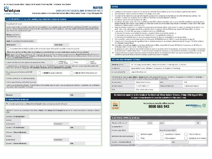 Nomination Process (continued) Candidate must state if standing in any other elections in NZ • Mayor, Ward/At Large Council, Comm Bd, LTs, DHB, other TAs? • Is shown at top of profile statement • Is not included in the 150 words • Applies to standing anywhere in NZ • Must update earlier nomination form if not included • Nomination paper is a public document, open for inspection Candidate must state if reside in area of election or not • My principal place of residence is WITHIN / is NOT WITHIN the area • Is shown at the top of the profile statement • Is not included in the 150 words Other elections • Waikato DHB noms to Hamilton City Council office only