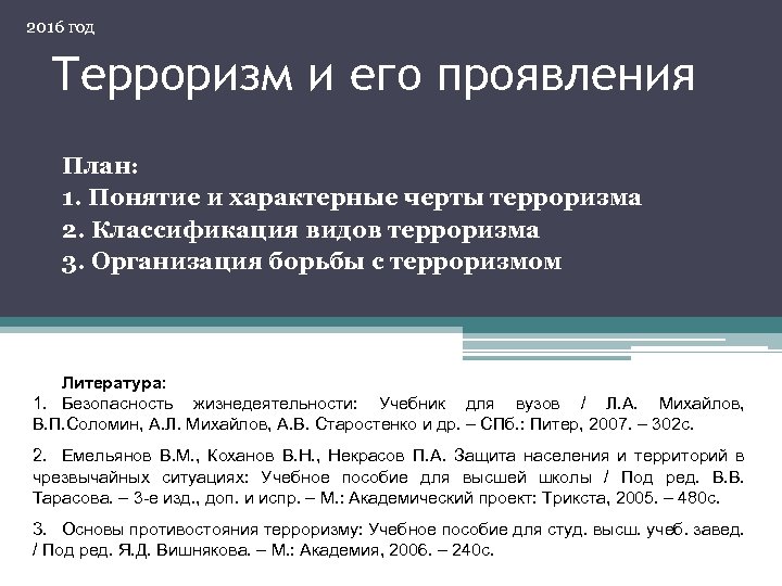 2016 год Терроризм и его проявления План: 1. Понятие и характерные черты терроризма 2. Классификация видов терроризма 3. Организация борьбы с терроризмом Литература: 1. Безопасность жизнедеятельности: Учебник для вузов / Л. А. Михайлов, В. П. Соломин, А. Л. Михайлов, А. В. Старостенко и др. – СПб. : Питер, 2007. – 302 с. 2. Емельянов В. М. , Коханов В. Н. , Некрасов П. А. Защита населения и территорий в чрезвычайных ситуациях: Учебное пособие для высшей школы / Под ред. В. В. Тарасова. – 3 -е изд. , доп. и испр. – М. : Академический проект: Трикста, 2005. – 480 с. 3. Основы противостояния терроризму: Учебное пособие для студ. высш. учеб. завед. / Под ред. Я. Д. Вишнякова. – М. : Академия, 2006. – 240 с.
